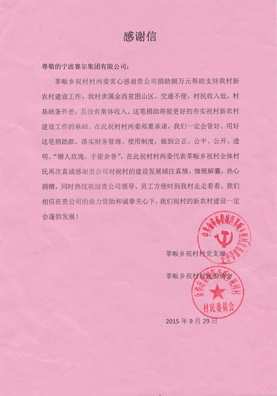 幫助祝村修路,只是近年來我集團履行社會責任的一個側面,也是集團“賽爾愛農”慈善基金的最新項目,近年來,“賽爾愛農”項目已捐助貴州、麗水、奉化等多地農村的老年活動中心、希望小學、村級道路等多個基礎設施項目,累計捐款近400萬元。