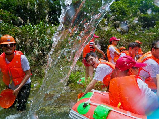 清涼水花飛濺引來女生們的聲聲尖叫,男生們則吼著嗓子大喊爽快。崎嶇的漂流水道驚險(xiǎn)刺激,橡皮船橫沖直撞,險(xiǎn)些卡在突起的石塊中間,很快就被后續(xù)飛沖下來的橡皮船撞開,猶如一場激烈的水上碰碰車大戰(zhàn)。每到一個水流平穩(wěn)的地方,部分男同事棄船蹲點(diǎn),準(zhǔn)備好滿滿的水,等待著被水流沖下來的同事展開密集的潑水攻勢,女生們力氣不敵男生最終敗下陣來舉白旗投降,有些男同事奮起對戰(zhàn)猛烈潑水,卻也因寡不敵眾輸?shù)脩K烈。
