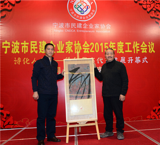 會議還舉辦了中國藝術研究院中國版畫院副院長、寧波大學潘天壽藝術設計院院長、寧波同心書畫院院長徐仲偶先生的“詩化人生”當代藝術展開幕式,徐仲偶院長捐贈兩幅作品和其他幾位寧波本土藝術家捐贈的作品一道參與現場慈善義拍,拍賣所得善款捐贈給寧波民建85周歲以上老會員。義拍現場的火爆氣氛和室外的陰冷天氣形成了鮮明的對比,民建企業家們愛心熱情高漲,紛紛舉手搶拍,贏得現場陣陣掌聲。賽爾集團徐平炬總裁以6.5萬元拍得現場最貴一幅作品,再次展現了賽爾集團對民建老年會員的敬意與愛心。