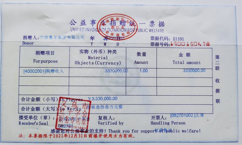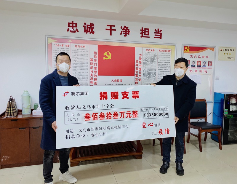 2月3日,賽爾集團(tuán)派代表分赴寧波市、義烏市兩地政府指定的接受捐贈主體單位——寧波市慈善總會和義烏市紅十字會,將666萬元善款(兩地各333萬元)一次性捐贈到位,全力支持抗擊新冠病毒肺炎疫情。