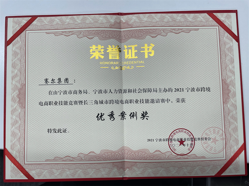 本次大會設置五大獎項,用于支持和鼓勵我市跨境電商企業的快速發展和良好成果。賽爾集團憑借自身在跨境電商業務領域的提前布局和探索實踐取得了持續增長,根據項目評委組對集團跨境電商業務和人才的全面評估,授予集團由寧波市商務局、寧波市人力資源和社會保障局共同頒發的跨境電商優秀案例獎。