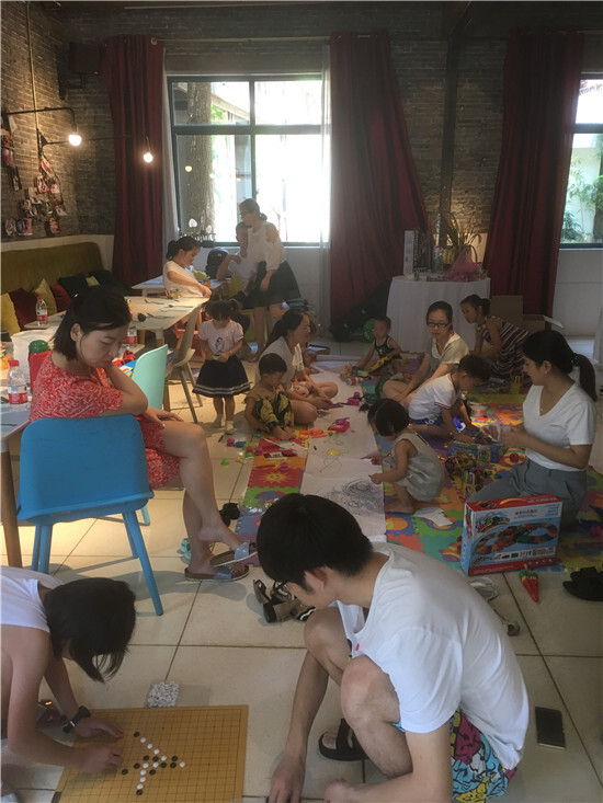 8月4日,天氣晴朗,優(yōu)景公司第一屆親子活動在大步里院拉開了序幕。共有13組家庭報名參加,其中3-5歲的寶貝居多。早上9點(diǎn)半,大家陸續(xù)來到大步里院,孩子們一看見我們?yōu)樗麄兙臏?zhǔn)備的畫板、水彩筆、印章等玩具,都迫不及待地脫掉鞋子,來到EVA墊子上,歡快地玩耍起來。