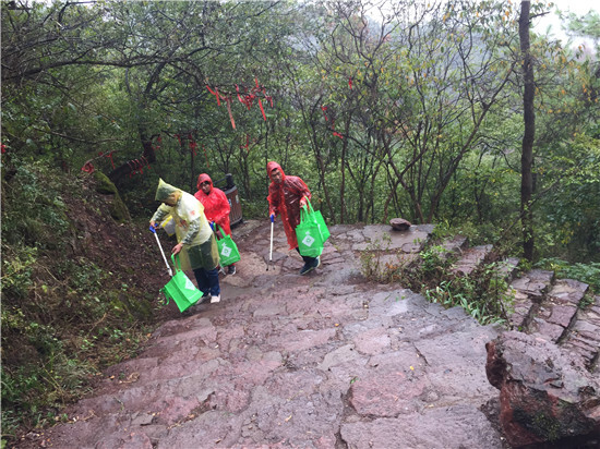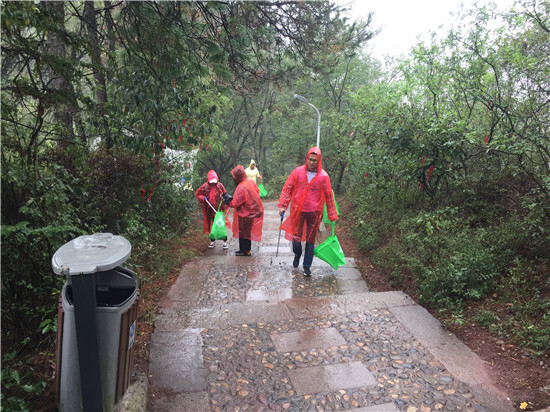 天公不作美,密集的雨點從四面八方打來,卻絲毫沒有影響大家的興致,抵達終點后,大家各自拿好夾子和垃圾袋,穿好雨衣,一切就緒后,就開始行動啦。因為下雨,大家互相幫忙,風雨無阻,不放過任何一個死角,撿拾一路上的各種垃圾。隨行隊伍中,一位供應商朋友帶了自己的小孩來參加此次公益活動,要給小孩從小樹立保護環境,不亂扔垃圾的好習慣。到達半山腰的時候,大家休息了一會,等待后面的伙伴們一同前行。在大家的歡聲笑語中,很快就到達了山頂,山頂云霧繚繞,下雨后空氣也變得格外清新。