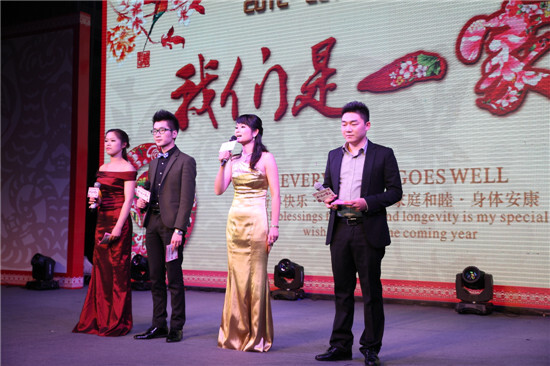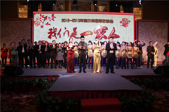 2月23日晚18:30,集團2012-2013度“我們是一家人”主題大型聯歡晚會在高貴典雅的T臺Fashion秀中拉開序幕。集團全體董事及600多名員工參加晚會。晚會由晚宴、節目表演、幸運抽獎、節目評比等環節組成。晚會主持人由集團行政人事部胡靜靜、賽爾國貿吳錫東、優景進出口付潔、優勝國貿王淑樂四人擔任。