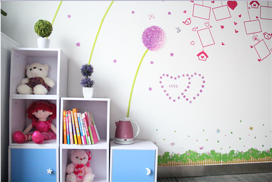 小清新書柜,配上紫色蒲公英墻貼,為整個母嬰室增色了不少,書柜中放置有精心挑選的哺乳知識用書,可供賽爾媽媽們閱讀,做到科學哺乳,哺育聰明寶寶。書柜中也可放置一些媽媽們的其他用品。