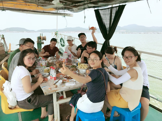 第二天一早,我們驅車來到了翡翠灣碼頭,開始了游船之旅。大家都很興奮地登上了船,看著船夫撒下漁網,我們吹著海風,聽著徐哥的介紹,感覺十分愜意。搖搖晃晃一段時間后,船夫拉起漁網,我們看到了各種海鮮,梭子蟹,青蟹,蝦,魚等,美味的午餐有戲咯。大家都很享受同事之間的談笑風生,閑聊嬉戲的氛圍。結束了午餐后,我們踏上了回程,結束了這美好的周末。
