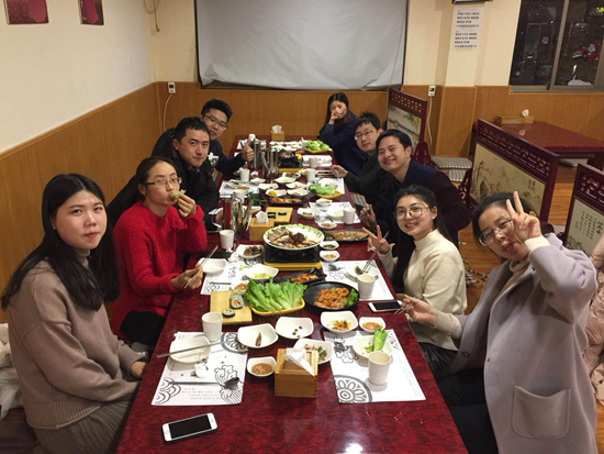 聚餐總少不了聊天說笑,大家嘮嘮家常,說說最近的喜事趣事煩心事,都覺得很開心。正像一家人其樂融融地吃著團圓飯,了解各自工作以外的生活,同時也讓方葉同學更好地融入我們。