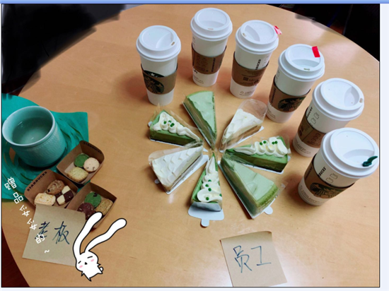 第一響來自星爸爸~派了毛毛姐和徐靜小姑娘充當(dāng)“快遞小妹”。這是第幾次星爸爸下午茶,小編有點記不太清了。唯一不變的是張總自己依舊沒分,喝的還是自己泡的小青柑?然后,被一堆贈送的小餅干包圍。
