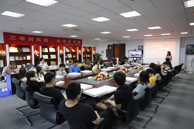 為了慶祝這一喜慶的日子,綠時舉辦了一場三周年慶交流會暨團建活動。當天下午的交流會于寧波18樓1802會議室舉行,義烏員工以視頻方式一同參會。會議伊始,綠時為每一位員工準備了豐富的水果、甜點和飲品,并為每個綠時人分發(fā)了帶有公司logo的小米體脂稱,真可謂“吃飽喝足干勁足,勞逸結合創(chuàng)佳績”。