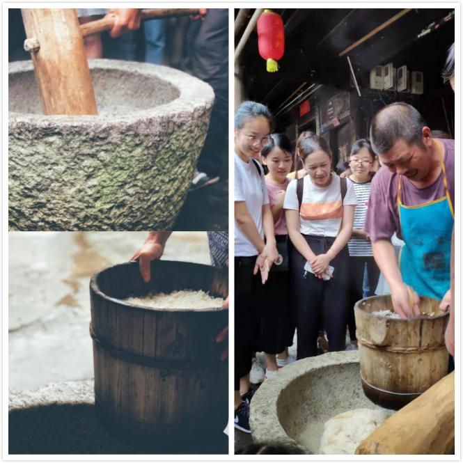游戲過后,大家開始體驗(yàn)外婆坑的特色項(xiàng)目:打麻糍和磨豆?jié){。打麻糍雖然看起來簡單,可是當(dāng)大家上手體驗(yàn)之后才發(fā)現(xiàn)這個(gè)體力活一般人可是無法勝任。搗爛后的糯米裹上紅糖或咸菜,麻糍就這樣新鮮出爐啦。浸泡過的大豆混水倒進(jìn)石磨口,推動(dòng)石磨轉(zhuǎn)起來,豆汁就徐徐地流出。體驗(yàn)一把磨豆?jié){再喝上現(xiàn)做的豆?jié){,感覺這豆?jié){特別醇正。