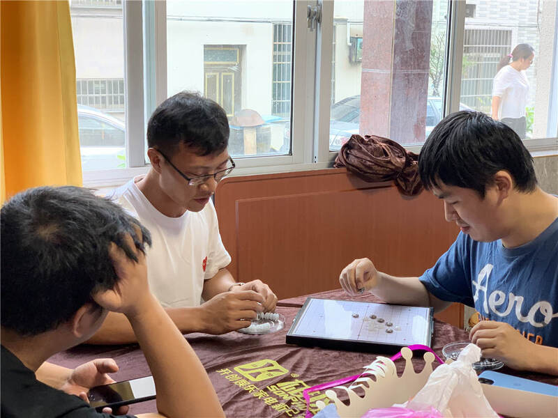 短暫休整后,大家各自組隊(duì)開始戰(zhàn)斗,有 “國(guó)粹”比賽,有五子棋、象棋等棋類項(xiàng)目,有“力爭(zhēng)上游”“環(huán)環(huán)相扣”等新式比賽,期間還穿插了“畫畫傳遞猜詞”“害你在心口難開”“交換名字”等趣味游戲,好不熱鬧。