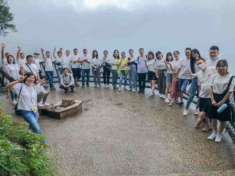 第二天一早,大家整理好裝備,向雪竇山頂端的徐鳧巖出發。凌云玻璃棧道沿絕壁而建,垂直高度兩百余米。大家各自施展凌波微步,順利完成玻璃棧道的挑戰。之后又進行了集體跳繩、擊鼓傳花、狼人殺等拓展活動,在鼓掌和加油聲中,我們順利結束了此次團建活動。
