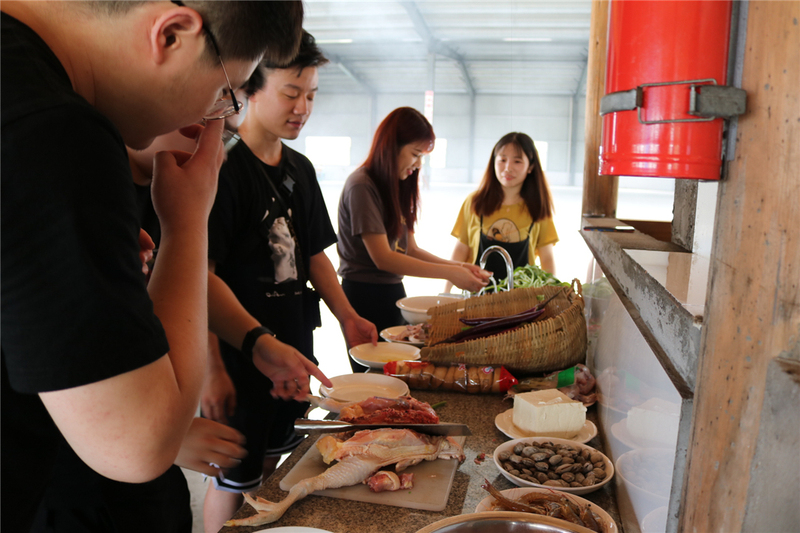 到了中午,大家分組用土灶燒火做飯。雖然難以抗拒夏日的炎熱,但大家齊心協力,各司其職,生火洗菜,做飯刷鍋,效率頗高。最后,一桌子的人間煙火就完成了。吃著大家一起做的飯,聊著天,工作的疲憊早已消散。