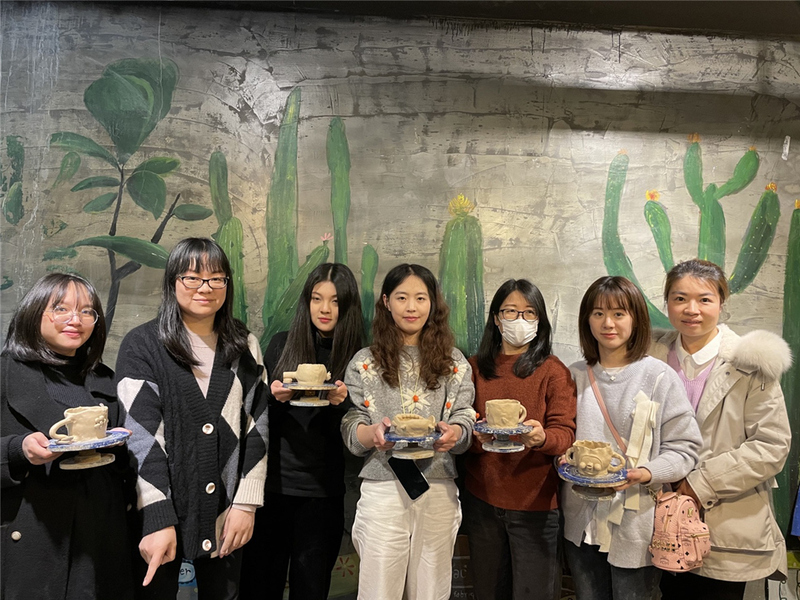 當天中午,大家約在鼓樓的“桃妝”吃飯,這是一家老網紅,菜色和環境都很不錯。最有特色的就是桃花酒啦,很值得一品,我們豪氣地一人來了一碗,干杯!午餐結束后則是最期待的陶藝DIY時間。大家各自選好想要制作的作品,開始埋頭認真制作。大家都是第一次做陶藝,手藝生疏得很,還好有老師指點,做出來的作品也都富有特色。