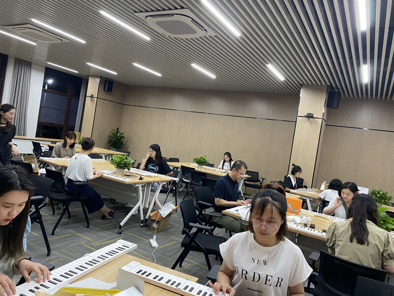 88個黑白琴鍵,15個心懷憧憬的學員,第一節課,歡歡喜喜又有點手忙腳亂,培訓室里老師耐心講解著鋼琴課的基礎知識,座位上學員們細心聆聽,低頭筆記。學員們三人一個小組,老師依次指導彈奏的姿勢和方法,教室中悠揚的旋律此起彼伏,課程慢慢接近了尾聲。通過第一節課的學習,學員們更加堅定了繼續好好學習折疊鋼琴的目標與決心。