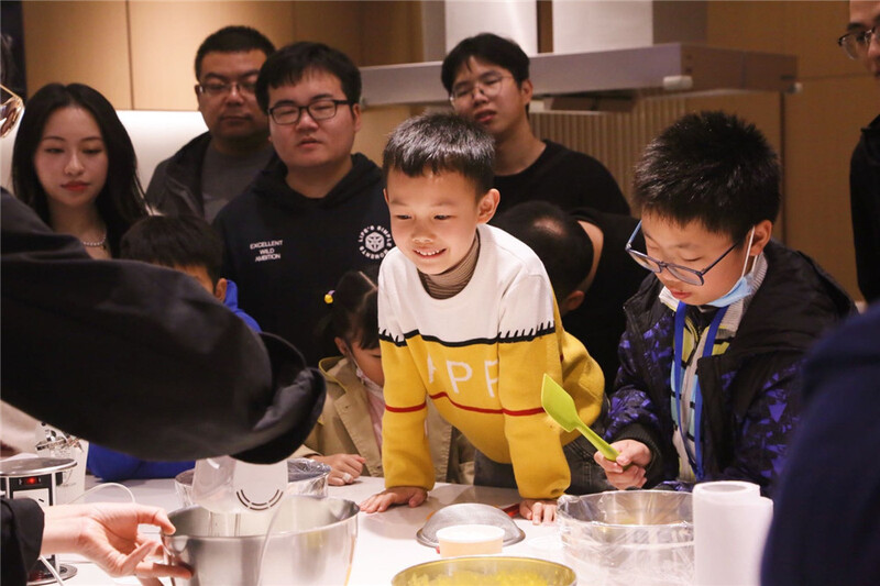 大伙兒滿懷期待,早早地到達集合地。在蛋糕師一輪耐心的實操教學后,大家迫不及待來到廚臺前進入DIY環節!平時在行行代碼間修正bug的IT小哥哥們,穿上圍裙后搖身成為米其林糕點師。60克牛奶,60克白糖,60克低粉,6個雞蛋…若干材料混合在一起,變化為面包坯原料。蛋糕制作中最重要也是最難的步驟是將蛋黃制作成蛋糊的乳化過程,但這也難不倒技術部的小哥哥小姐姐們,發揮理工科對精確性的把握,打蛋機手法和對時間的把控令人嘖嘖稱奇,不一會兒蛋糊就變得濃郁綿密,指導老師也對大家的成果贊不絕口。烤箱上下175度,烘培20分鐘,一塊塊香噴噴的面包坯就烤制完成,金黃色的蛋糕早就讓小朋友們都垂涎三尺。最后,奶油和水果粒組合定型,蛋糕完成。