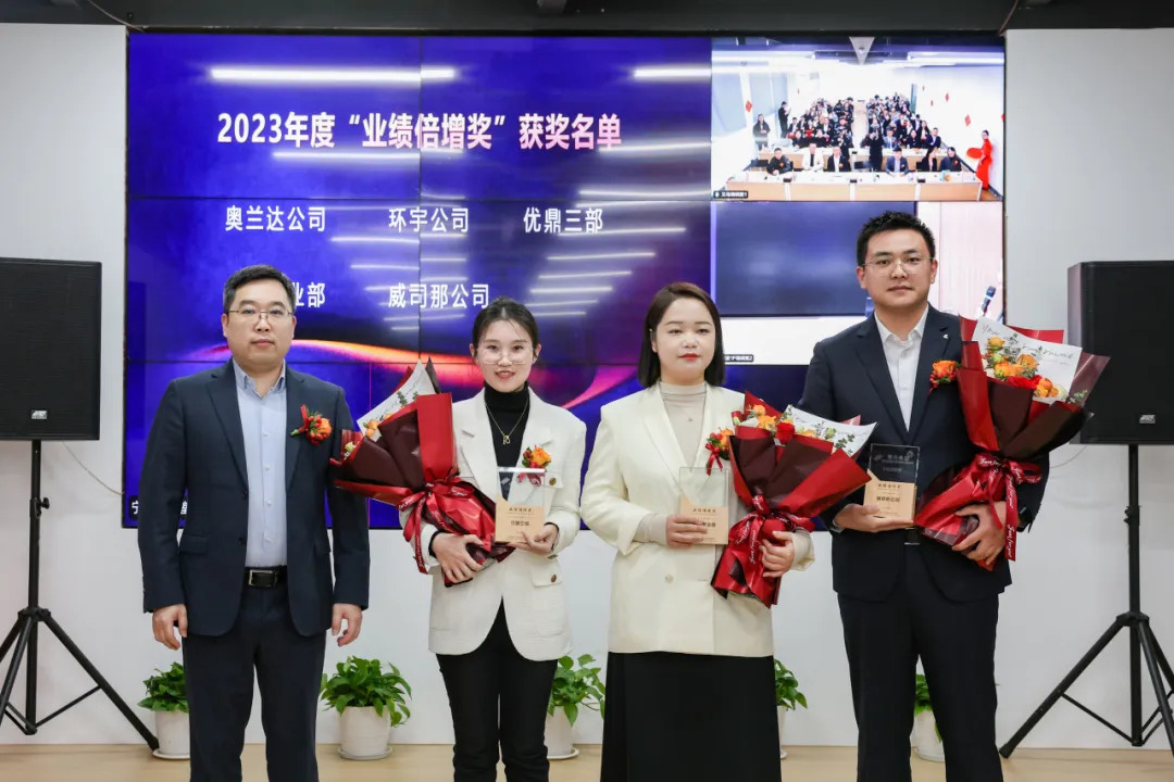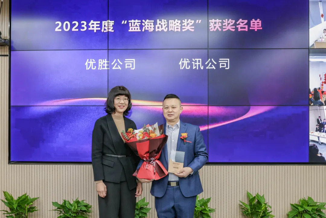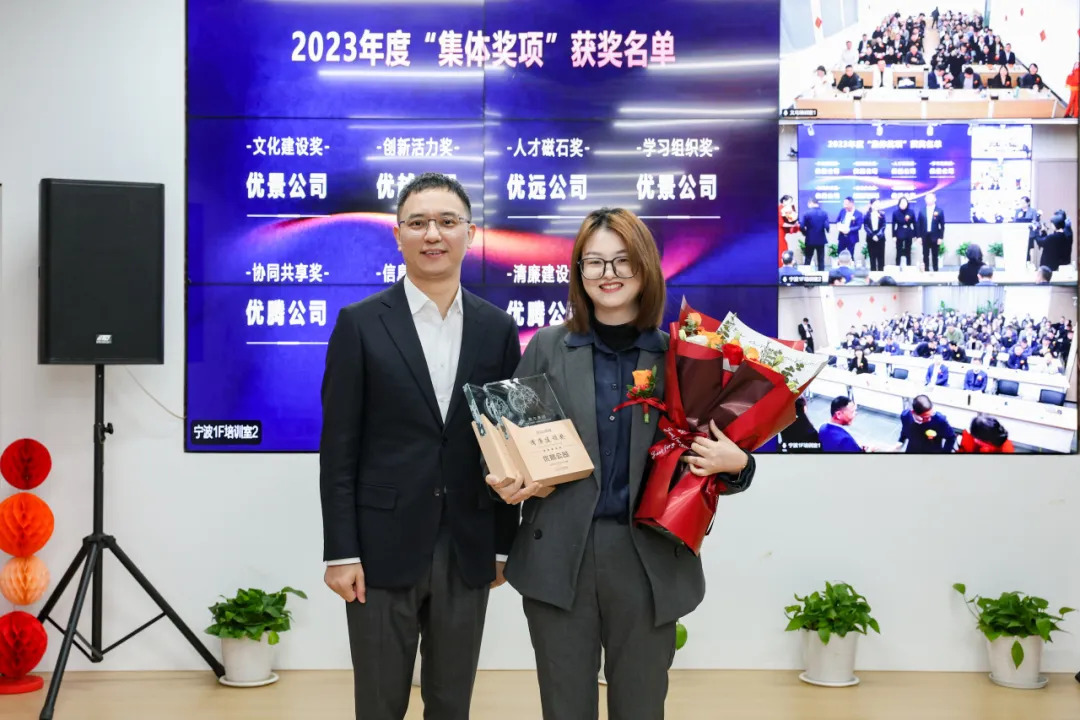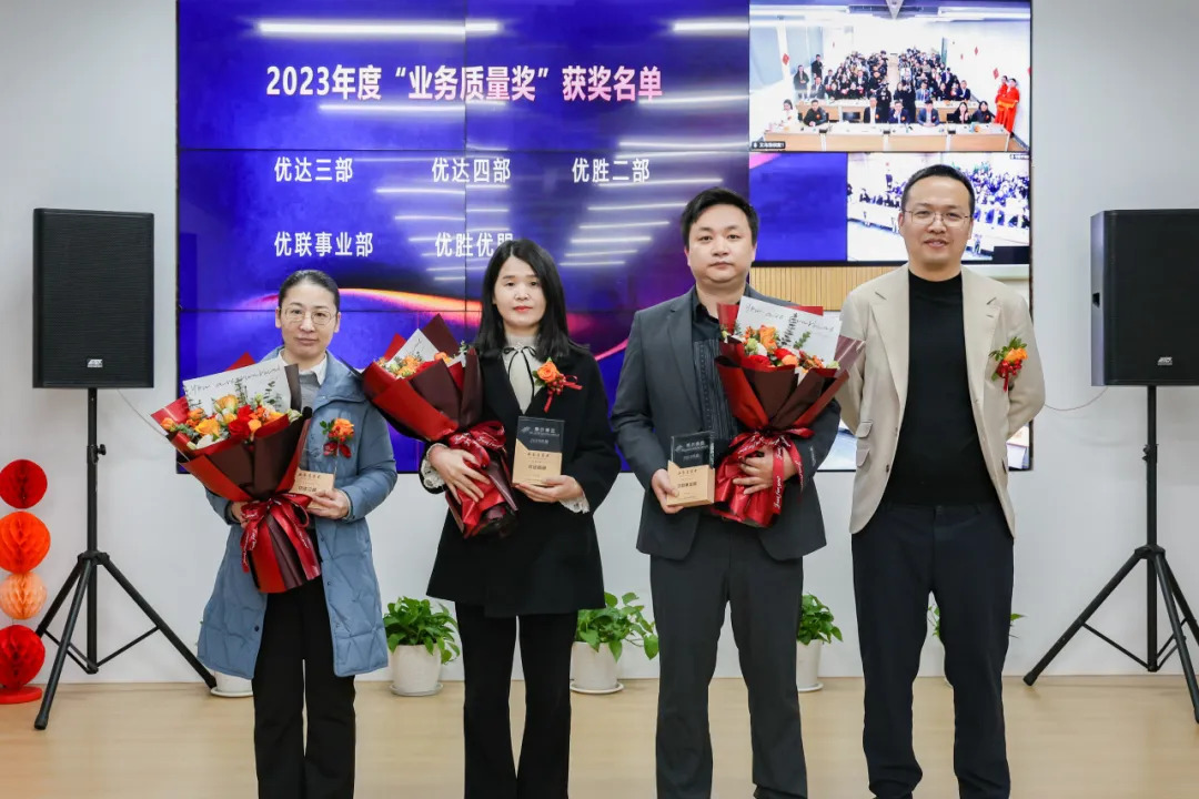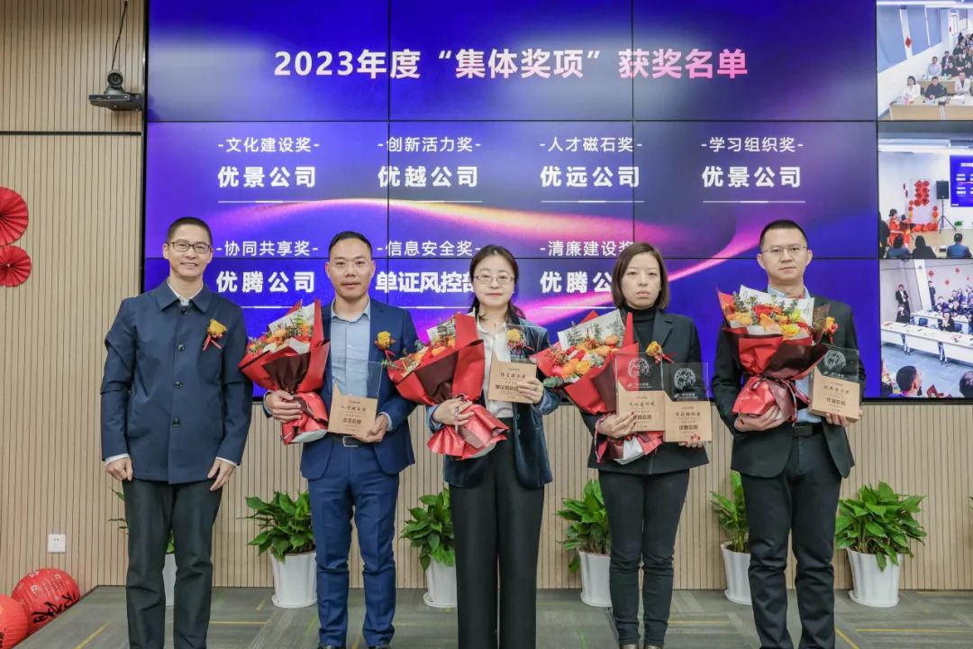 會議舉行年度重要獎項頒獎儀式。23年度集團設立集體獎項7個,優景公司榮獲文化建設獎和學習組織獎,優騰公司榮獲協同共享獎和清廉建設獎,優越公司榮獲創新活力獎,優遠公司榮獲人才磁石獎,集團單證風控部榮獲信息安全獎。23年集團設立團隊獎項6個,分別是藍海戰略獎、市場開拓獎、業績倍增獎、業務質量獎、網絡營銷獎和客戶服務獎,共有21個業務團隊獲得獎項榮譽。藍海戰略獎由優勝公司和優訊公司獲得,該獎項要求對新業態模式敏感,業務布局前瞻性強,有示范性新項目落地成功,公司業務布局成為集團重要業務賽道之一,陳勇珍和錢天鋒分別代表各自公司領取藍海戰略獎,所獲榮譽實至名歸。23年度陳勇珍、錢天鋒、王建、徐生科等四位業務總經理獲得個人獎項的最高榮譽金鼎獎,該獎項歷來以競爭激烈著稱,四位獲獎者憑借著業務規模、高速增長和盈利能力摘得金鼎桂冠。2023年度共有20位業務負責人憑借部門優秀業績,榮獲個人金牛獎項并現場上臺領獎。