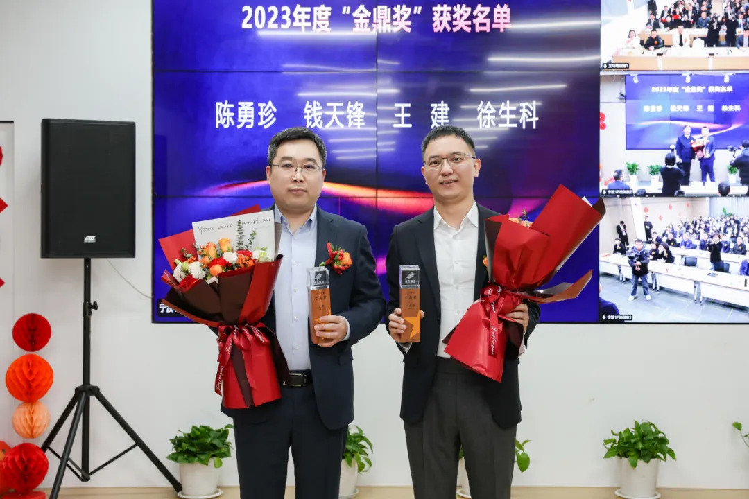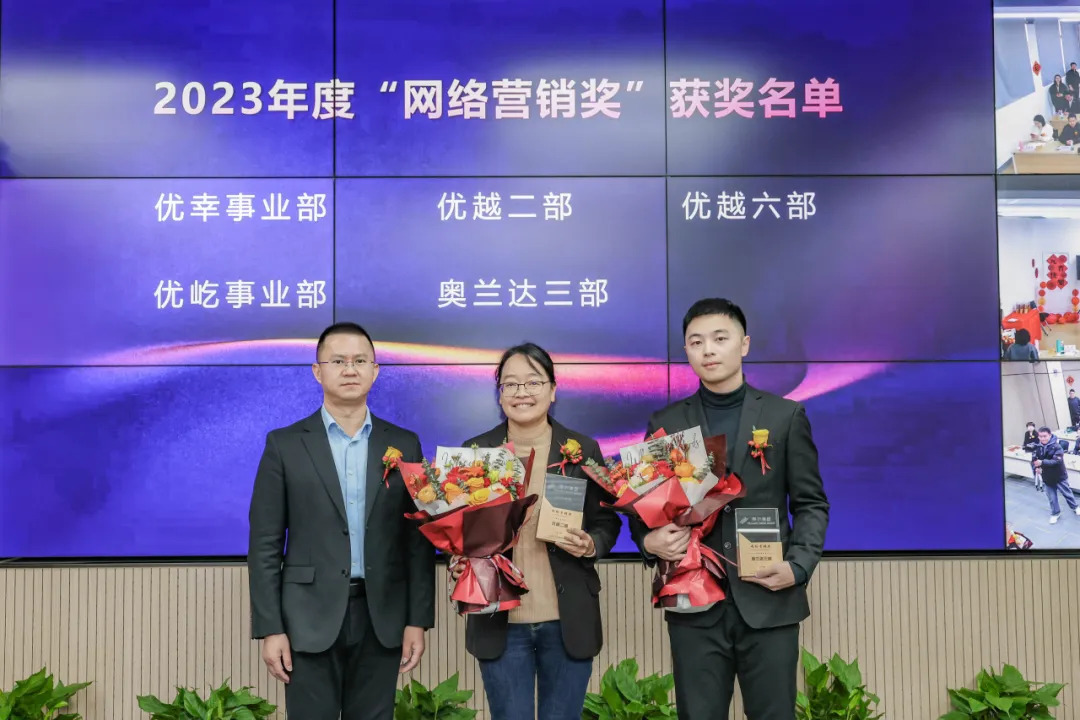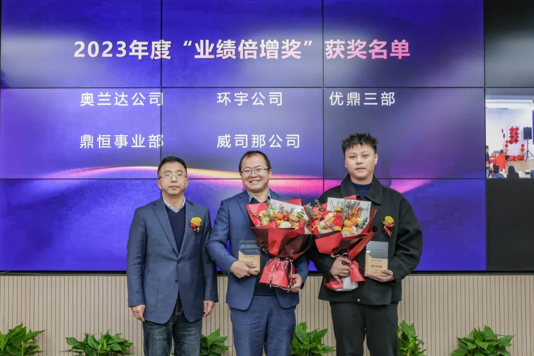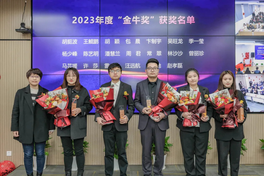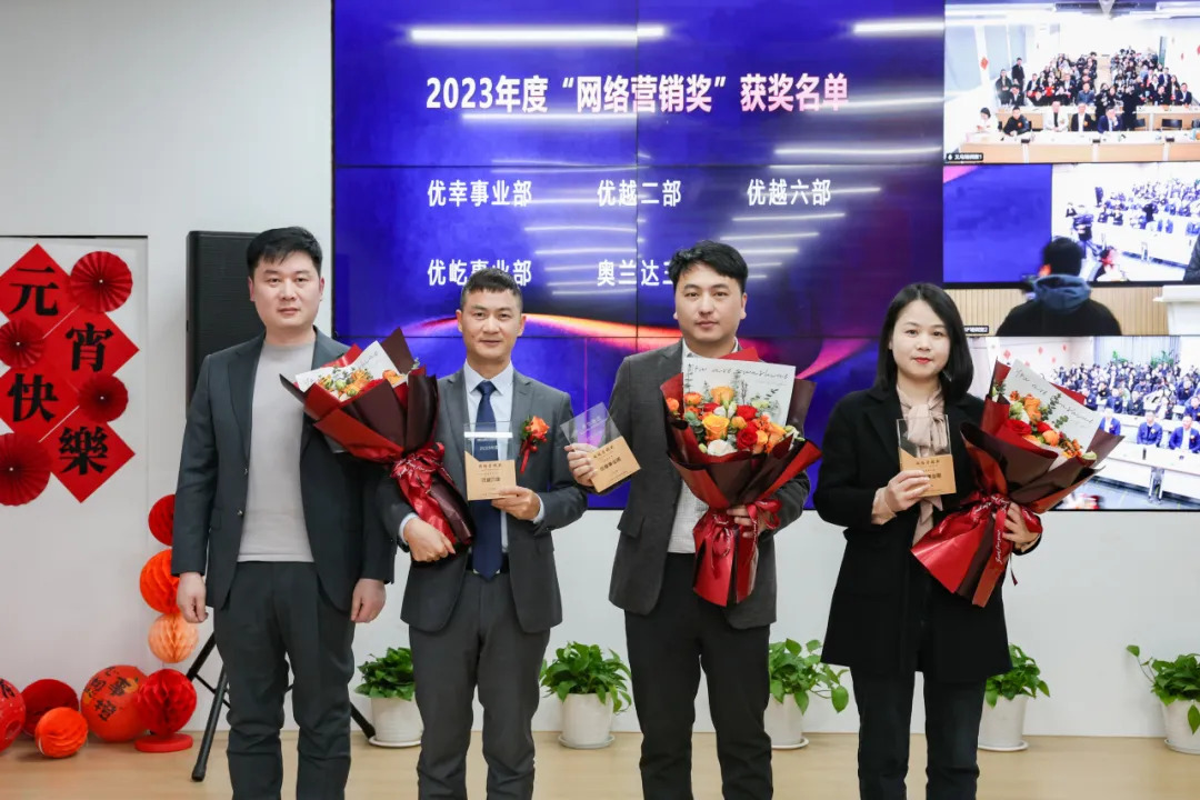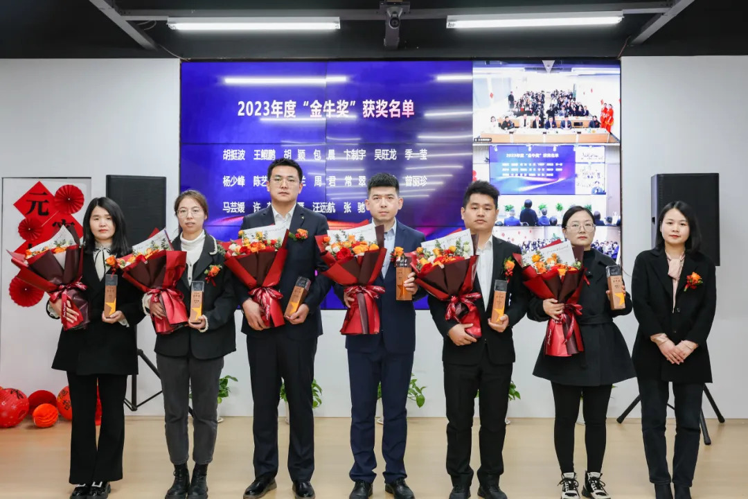 會議舉行年度重要獎項頒獎儀式。23年度集團設立集體獎項7個,優景公司榮獲文化建設獎和學習組織獎,優騰公司榮獲協同共享獎和清廉建設獎,優越公司榮獲創新活力獎,優遠公司榮獲人才磁石獎,集團單證風控部榮獲信息安全獎。23年集團設立團隊獎項6個,分別是藍海戰略獎、市場開拓獎、業績倍增獎、業務質量獎、網絡營銷獎和客戶服務獎,共有21個業務團隊獲得獎項榮譽。藍海戰略獎由優勝公司和優訊公司獲得,該獎項要求對新業態模式敏感,業務布局前瞻性強,有示范性新項目落地成功,公司業務布局成為集團重要業務賽道之一,陳勇珍和錢天鋒分別代表各自公司領取藍海戰略獎,所獲榮譽實至名歸。23年度陳勇珍、錢天鋒、王建、徐生科等四位業務總經理獲得個人獎項的最高榮譽金鼎獎,該獎項歷來以競爭激烈著稱,四位獲獎者憑借著業務規模、高速增長和盈利能力摘得金鼎桂冠。2023年度共有20位業務負責人憑借部門優秀業績,榮獲個人金牛獎項并現場上臺領獎。