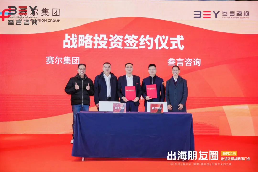 會上,賽爾集團與叁言咨詢簽署戰略投資協議,標志著雙方在“品牌出海+生態賦能”領域的合作正式啟動。